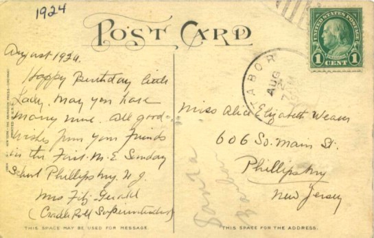 This postcard shows the parsonage (left) and church (right) of the First Methodist-Episcopal Church in Phillipsburg. Historically, the funeral home structure itself dates back to 1868 when it was erected as the parsonage for the First Methodist-Episcopal Church. However, the congregation first formed in 1826 in Phillipsburg and was known as the First Methodist "Class". That early congregation met in an old stone house on the southwest corner of Main Street at the old Central Railroad bridge. Then, in 1823, the gathering went to Easton, Pennsylvania, to mix with that assemblage. The Phillipsburg group later returned to Phillipsburg in 1854-55 to prepare the way for the creation of their own house of worship.